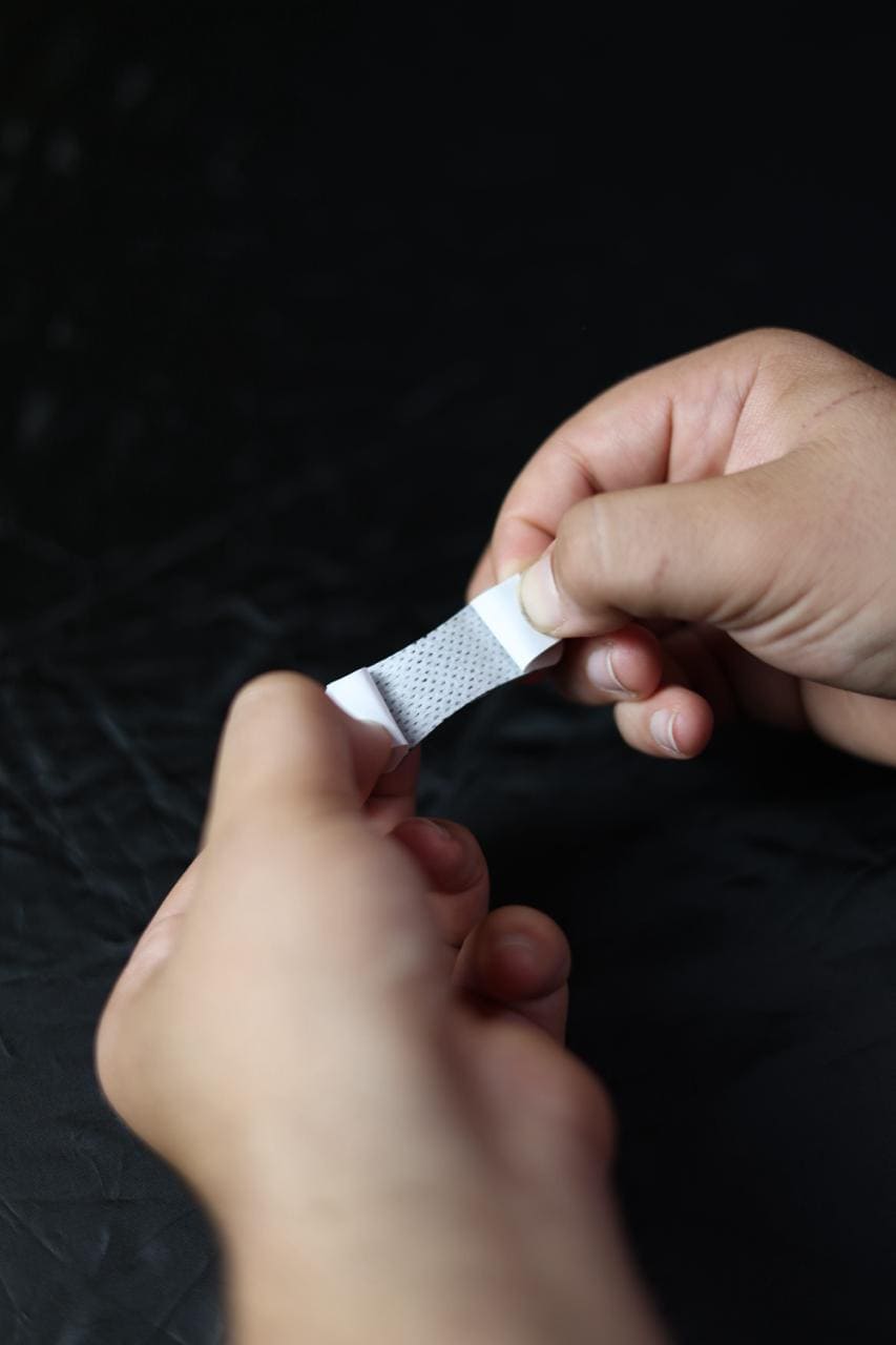 قم بإزالة بطانة الدعم بعناية من خلال الإمساك بشريط الأنف عند كل طرف وثني الشريط للداخل تجاهك للكشف عن المادة اللاصقة. قم بتقشير ورق الدعم من المنتصف، مع الحرص على عدم لمس المادة اللاصقة.