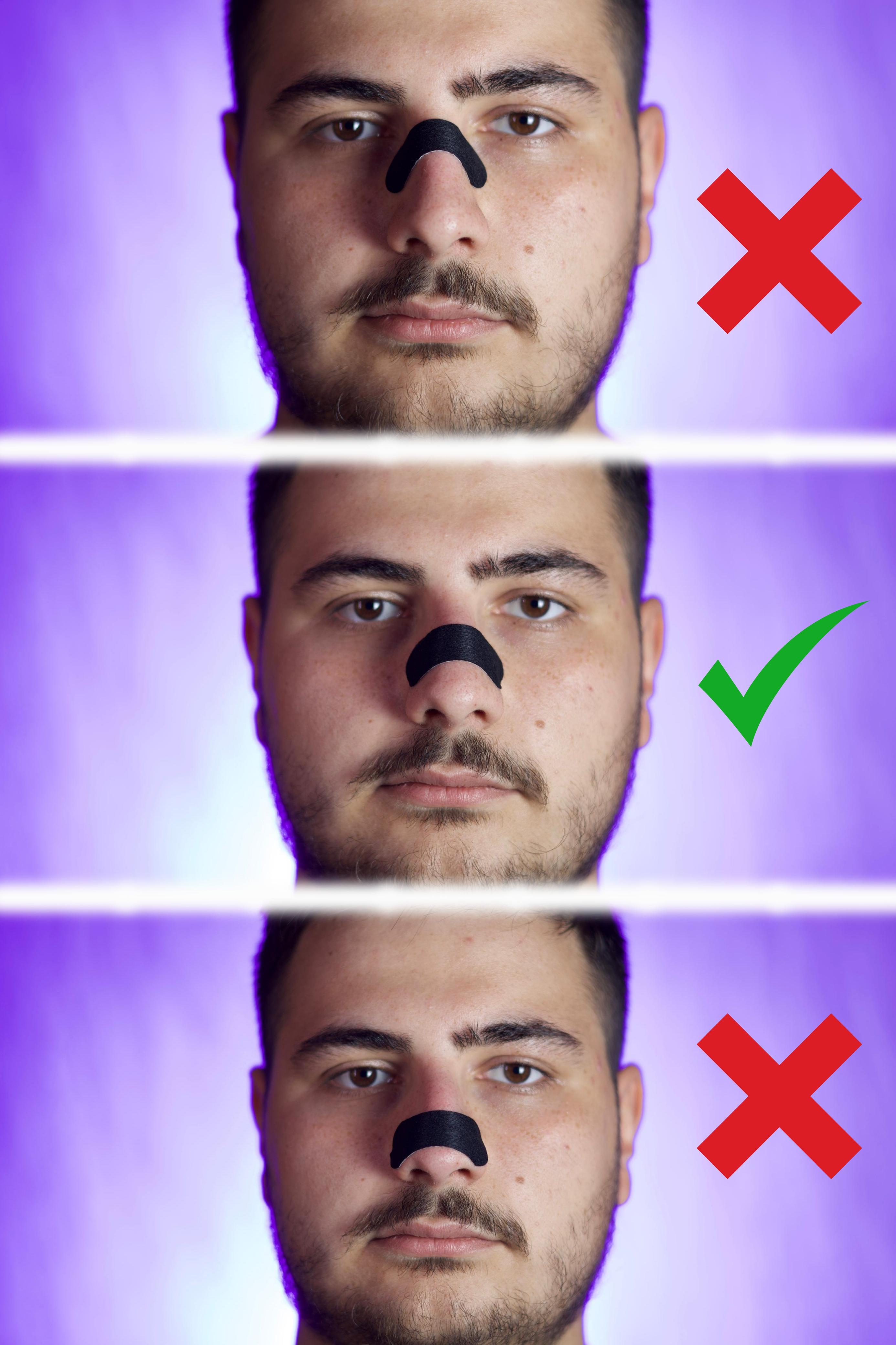 ضع شريط الأنف بشكل صحيح - ليس مرتفعًا جدًا أو منخفضًا جدًا. لن يكون الشريط الموضوع في مكان مرتفع جدًا فعالًا، وقد لا يظل الشريط الموضوع في مكانه بشكل آمن بسبب الحركة الناتجة عن توسع الأنف وزيادة إفراز الزيت.
